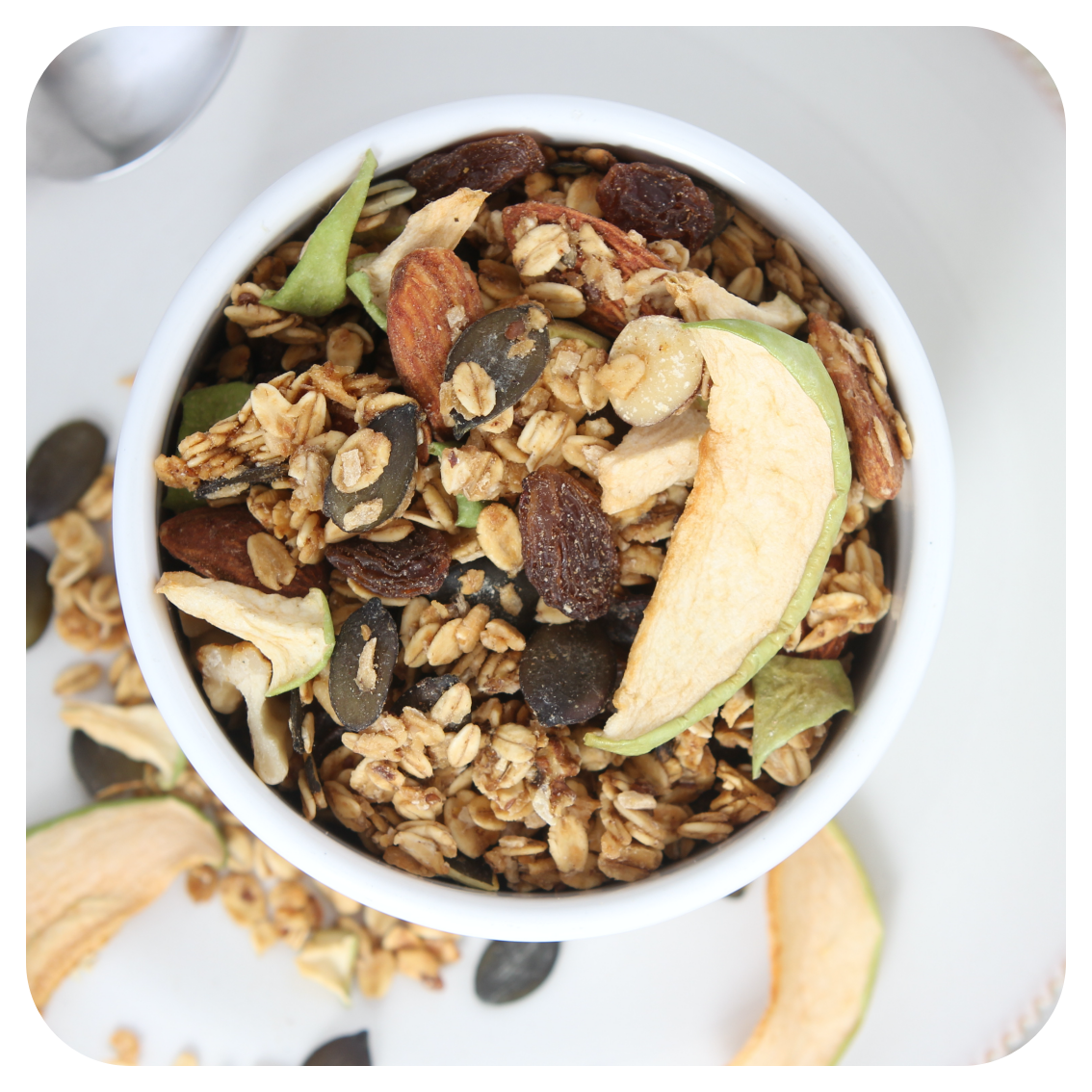 Élaboré en mélangeant l’avoine, la compote fait maison et du sucre de fleur de coco (IG bas). Pour le rendre plus croquant nous y ajoutons des noix du Brésil, des amandes, des noix de pécan, des graines de courge, graines de sarrasin et des pommes séchées. Nos granolas sont cuit à bas température au four pour garantir une durée de conservation plus longue sans utiliser d'additifs artificiels. Nous tenons beaucoup à ce que les ingrédients soient biologiques et locaux, ce qui est le cas de la plupart des ingrédients que nous utilisons.